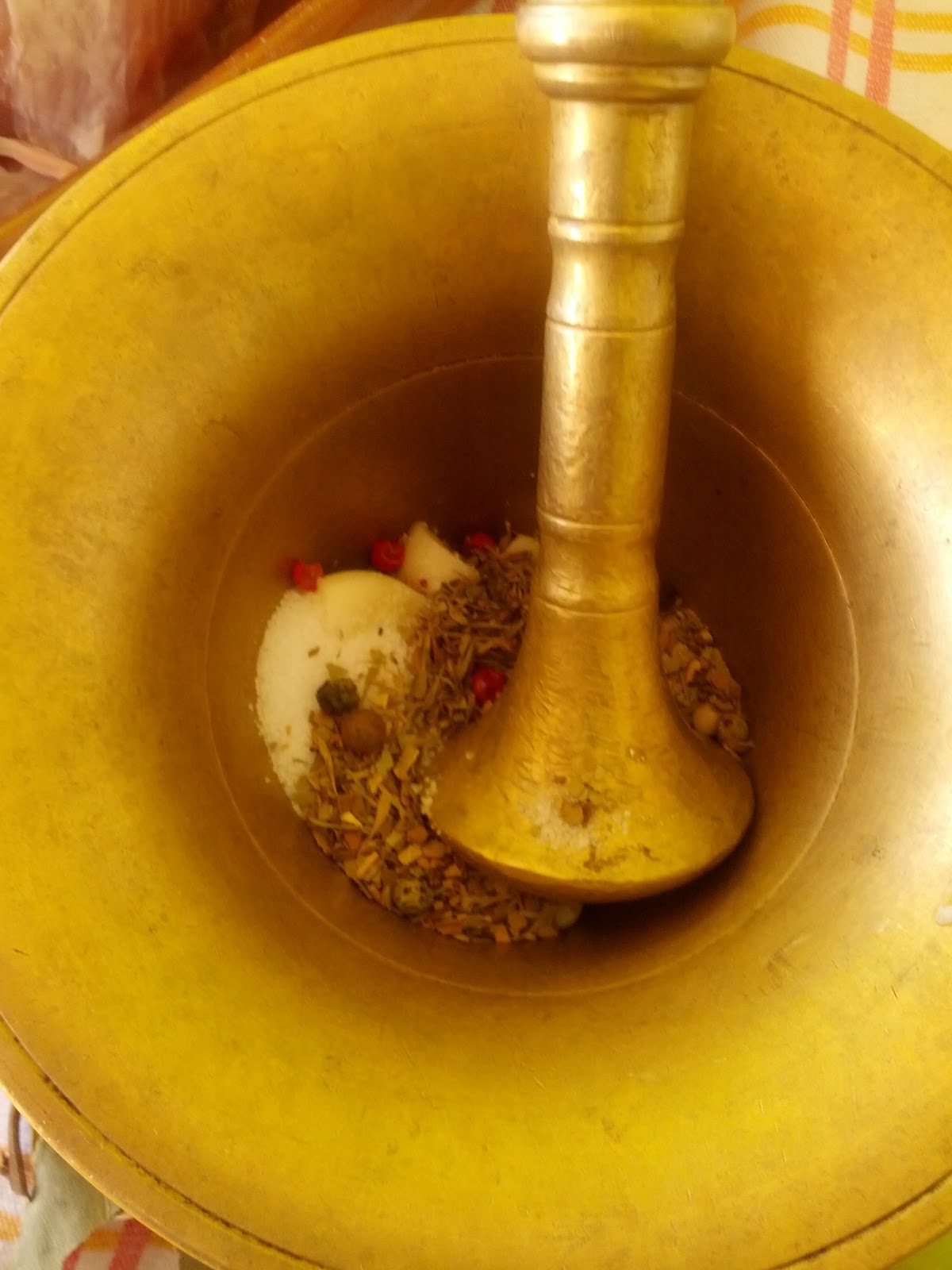 En una fuente de barro colocamos las dos piernas de cordero. Y en un mortero machacamos los ajos, el tomillo, la sal y la pimienta. Cuando esté machacado le añadimos un hilillo de aceite y volvemos a machacar.